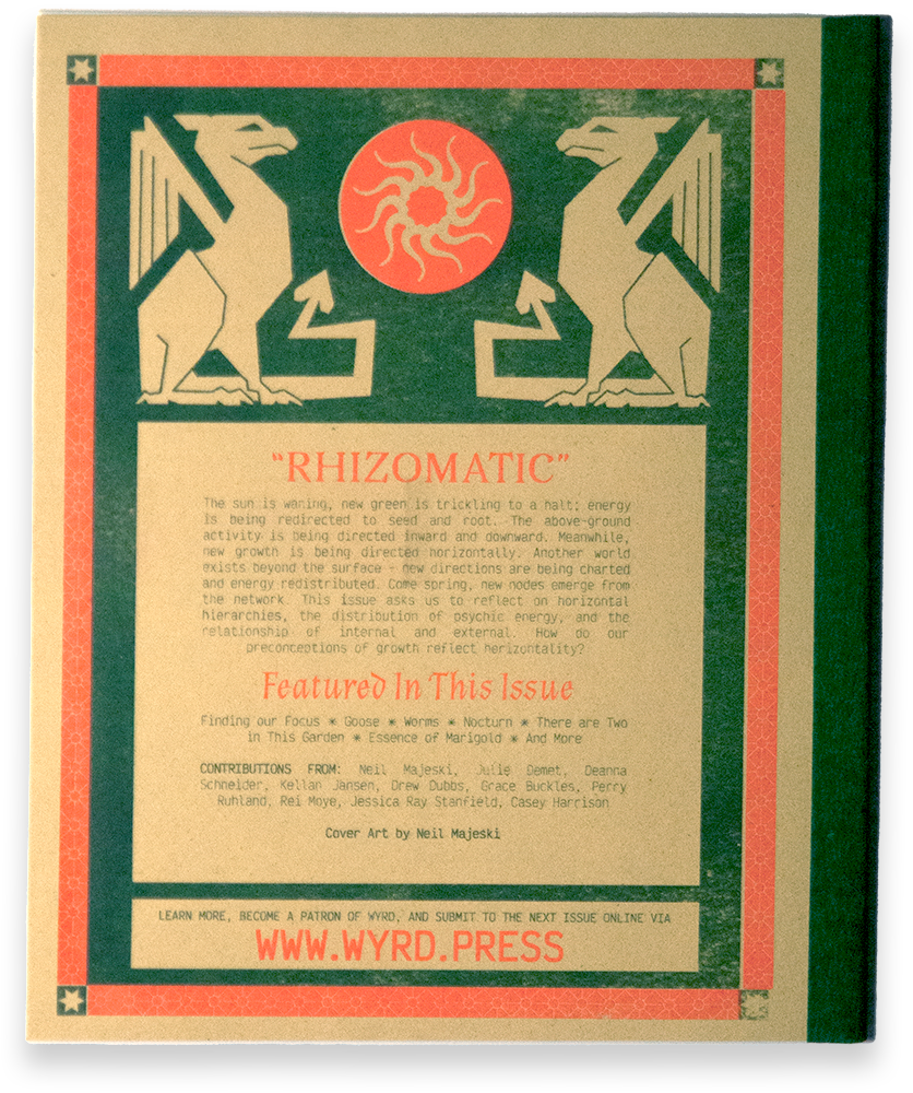 The sun is waning, new green is trickling to a halt; energy is being redirected to seed and root. The above-ground activity is being directed inward and downward. Meanwhile, new growth is being directed horizontally. Another world exists beyond the surface - new directions are being charted and energy redistributed. Come spring, new nodes emerge from the network. This issue asks us to reflect on horizontal hierachies, the distribution of psychic energy, and the relationship of internal and external. How do our preconceptions of growth reflect horizontality?